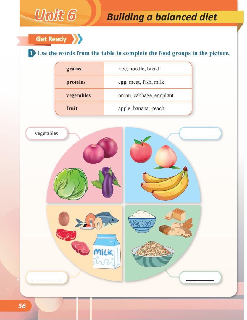 单元伊始,“Get Ready”板块并非直接呈现生词表,而是围绕“膳食平衡”这一主题,以分类图表的形式,引导学生激活并归类相关词汇:全谷物 (whole grains)、蛋白质 (protein)、蔬菜 (vegetables)、水果 (fruits) 等类别下分别包含哪些具体词汇。这首先在学生大脑中建立起一个主题语义场,让词汇以网络化的方式存储,而非孤立点状记忆。