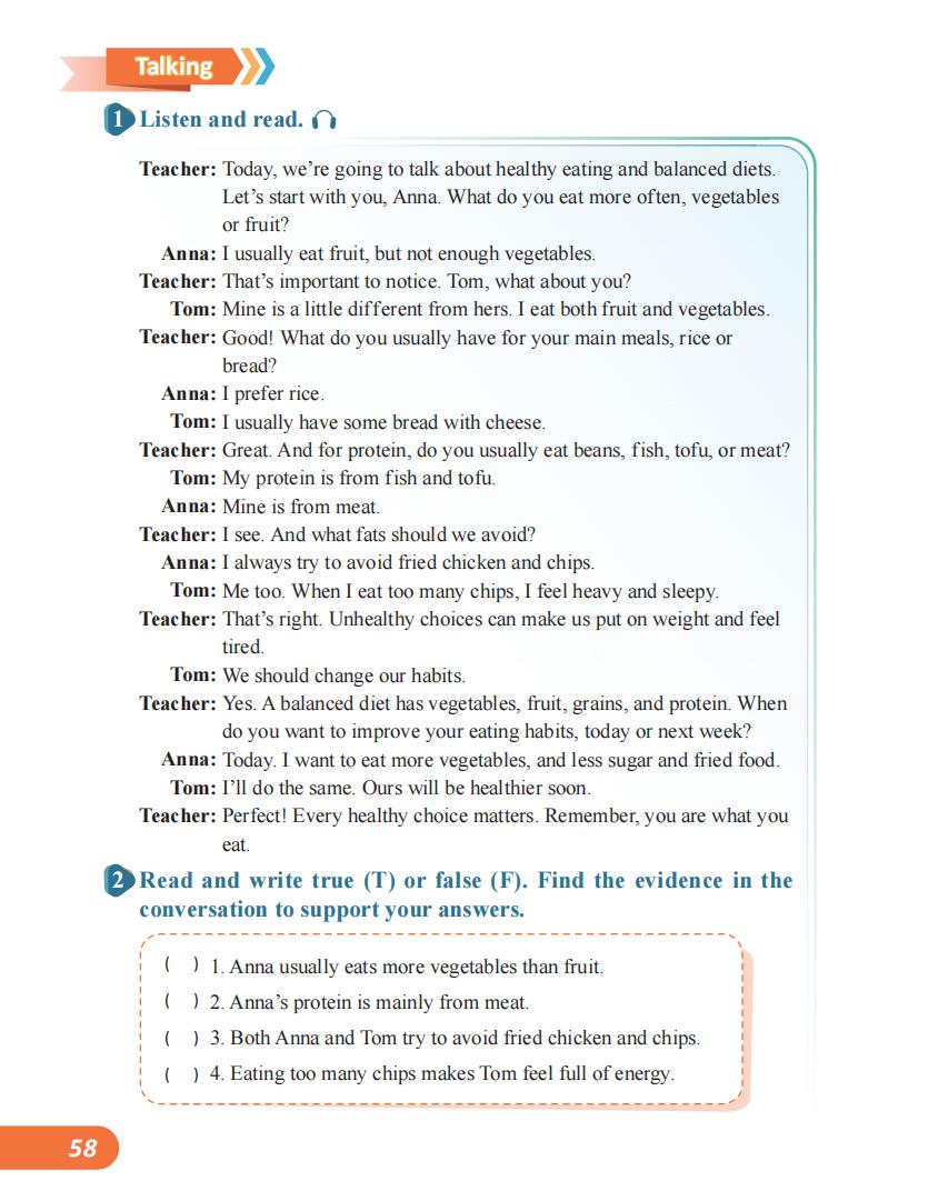 “Talking”板块提供一篇师生关于健康饮食的对话。此环节不仅复现和深化了主题词汇,更重要的是展示了如何在真实的交际场景中运用这些词汇进行提问、建议和解释,如“My protein is from fish and tofu./What fats should we avoid?” 这些语言进一步丰富了词汇的语用功能。