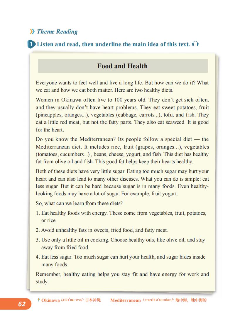 阅读板块是一篇关于饮食与健康的说明文,对比探讨日本冲绳岛老人的长寿饮食与地中海饮食。学生在扩充“get sick, lead to, stay away from, stay fit”等实用短语及固定搭配的同时,需要在复杂语篇中辨析熟词生义、理解派生词,并最终提炼出“膳食平衡与健康”的核心观点,实现词汇学习与思维训练的融合。