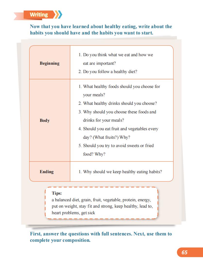 单元最后的“Writing”板块,要求学生运用本单元所积累的全部词汇网络和表达方式,在“设计一份健康食谱”或“提出饮食建议”等具体场景中,借助语言支架进行书面表达。这是词汇学习的终极检验和升华,确保学生能够主动、准确、创造性地输出。