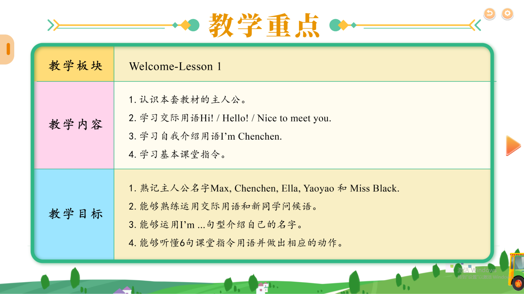 教学内容:26个字母的名称音、发音及书写。词汇128个,重点句型13组,歌曲歌谣14个,听力活动24个,口语表达练习12个。